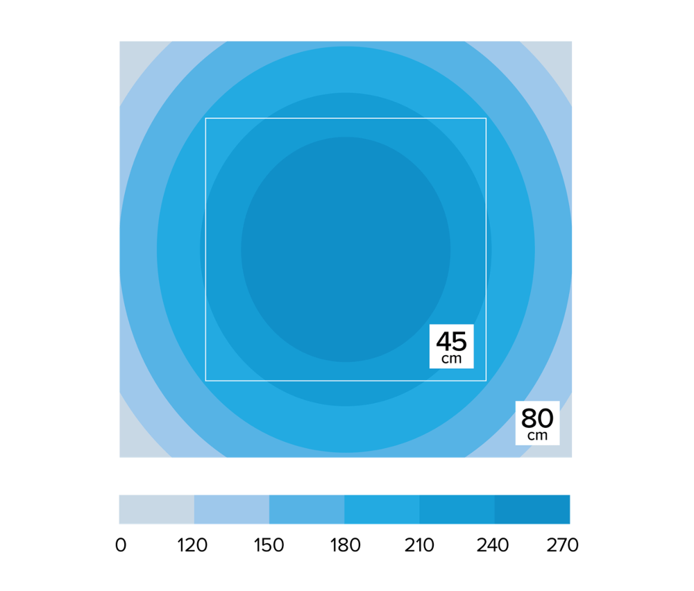 Weitwinkel-Linsen mit Blend-Schatten („anti-glare shade“) rund um die LED-Pucks; klare Optik bei gleichmäßiger Lichtverteilung.