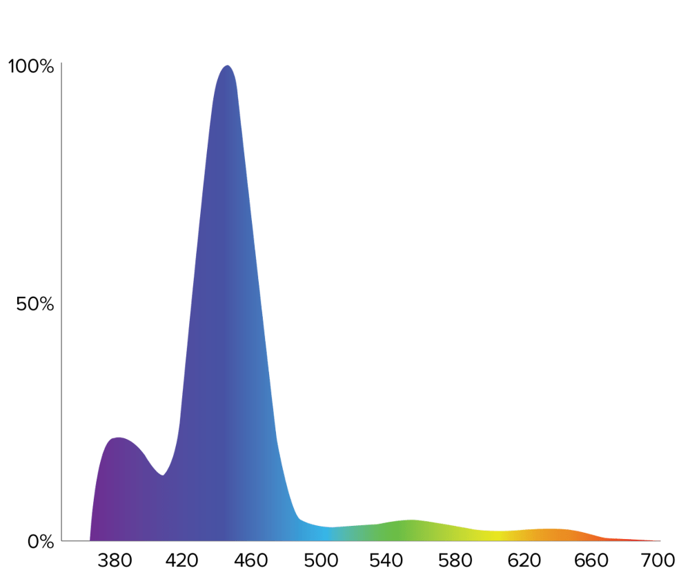 LED-Zusammenstellung 4× Cree Cool White, 1× Cree Warm White, 8× Cree Blue, 12× Cree Royal Blue, 2× Lumileds UV 400nm, 2× Lumileds Violet 415nm + 2× Violet 430nm – optimiert für Fluoreszenz und Farbwirkung.